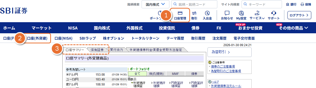 原則、約定日の当日19:30頃まで(※)に、ログイン後の当社WEBサイト「口座管理」>「口座(外貨建)」>「口座サマリー」や「保有証券画面」へ預り残高が反映します。