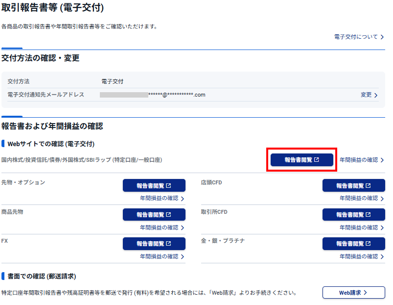 取引報告書、取引残高報告書などを閲覧する画面になります。