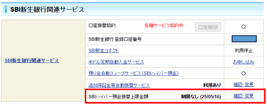 SBIハイパー預金の申し込み後に、SBI証券に資金を残しておく場合、当社WEBサイトにログイン後、「My設定」>「お取引関連・口座情報」画面を開き、「SBI新生銀行関連サービス」の「SBIハイパー預金振替上限金額」にて、SBIハイパー預金残高の上限を設定することで、設定金額以上の資金を証券口座に残すことができます。